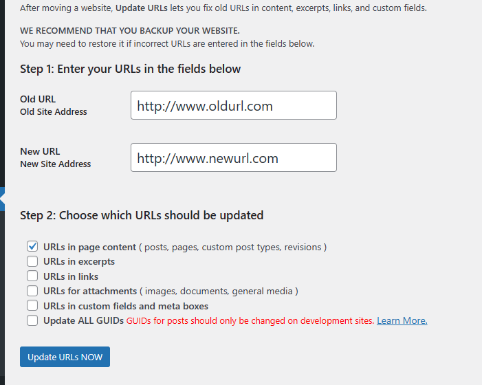 3. URLs in page content 이 외에 Update ALL GUIDs 를 제외하고, 다 체크 후 업데이트 해준다.