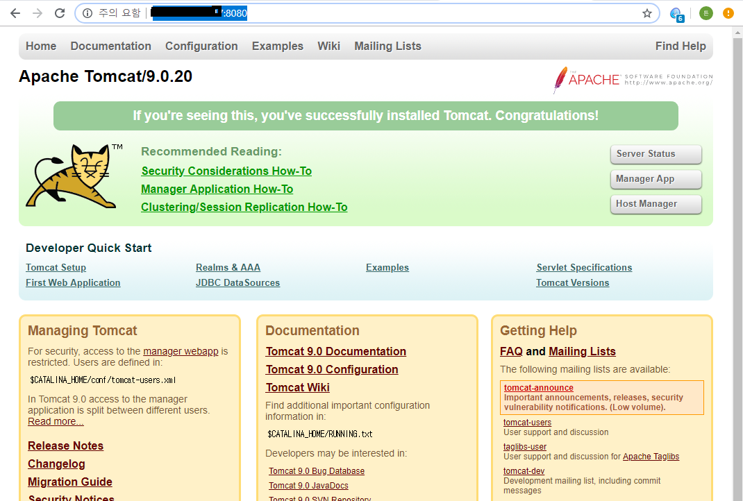 3. 일단 아파치를 접속하려면 http://외부ip주소:8080 이런 형식으로 접속해야 한다.