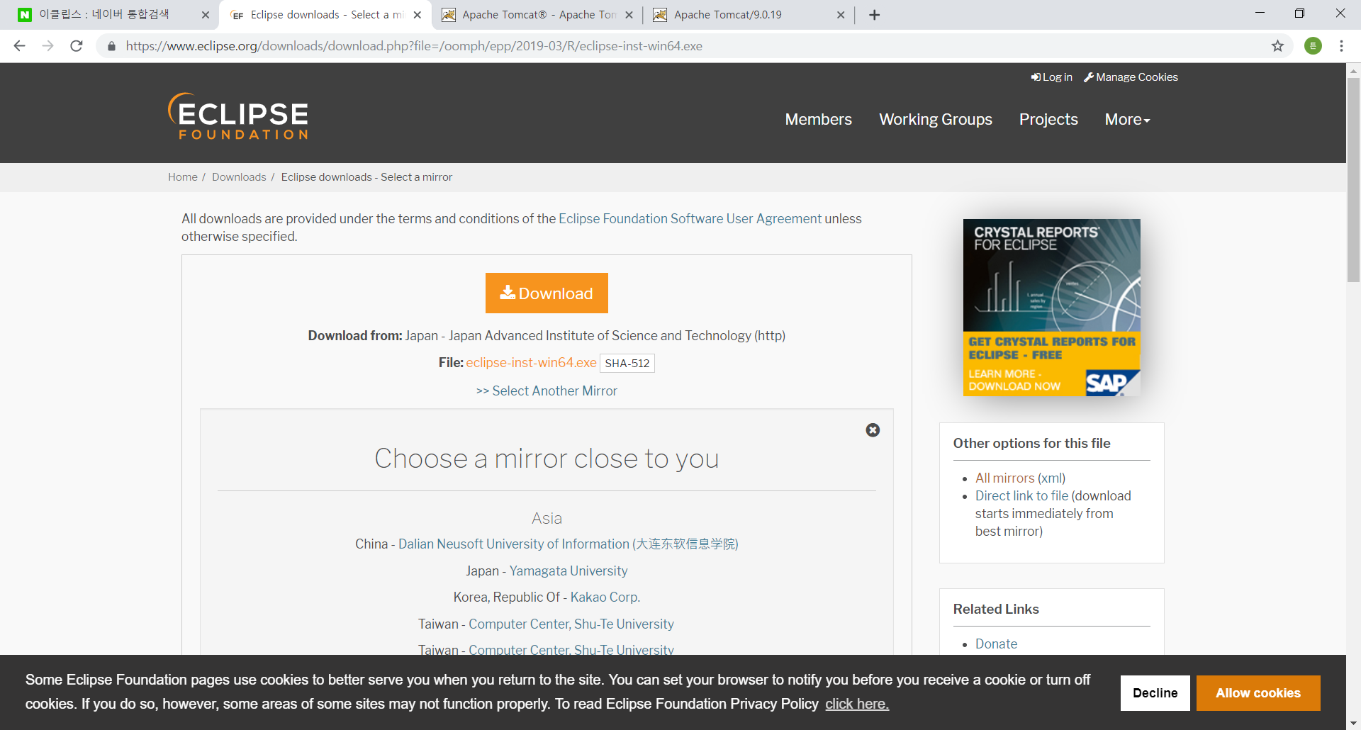 저기로 들어가면 이클립스를 받을 수 있는 홈페이지가 나옵니다.