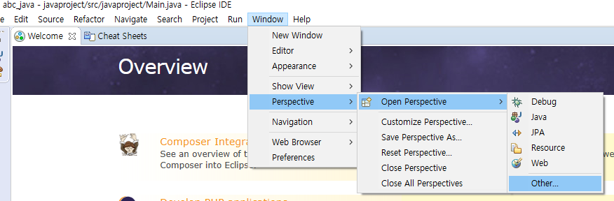1. 메뉴 바 - Window - Open Perspective - Other - J2EE