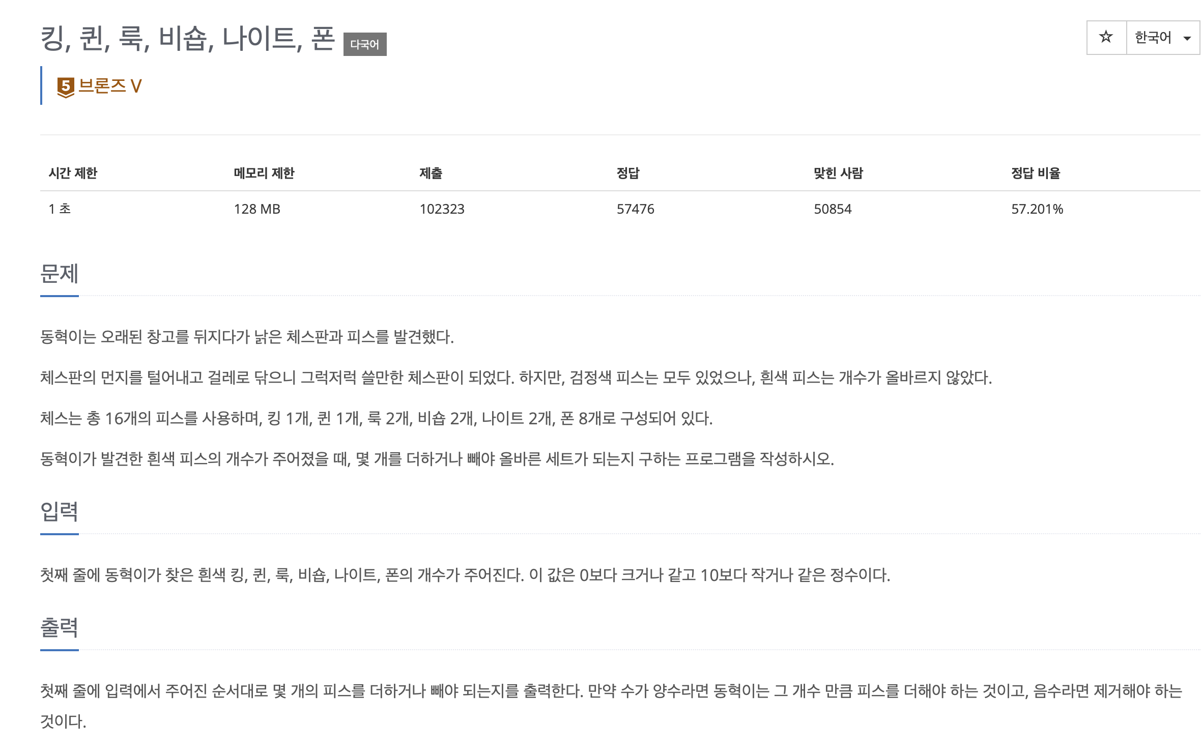 - [백준] - 3003 - 킹, 퀸, 룩, 비숍, 나이트, 폰 2023.10.30