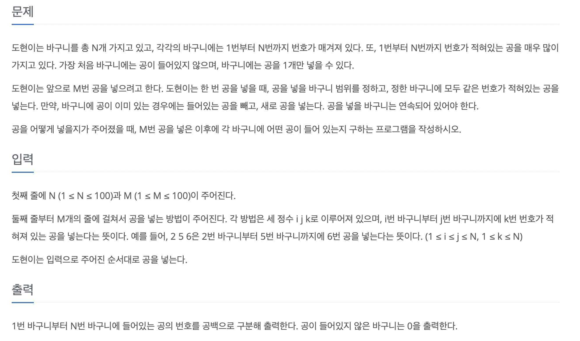 잘보이지 않았다. 바구니 갯수를 반복해야할까? M번 공을 넣으려고 한다는 말을 아예 뺏으면 안헷갈렸을 것 같다.