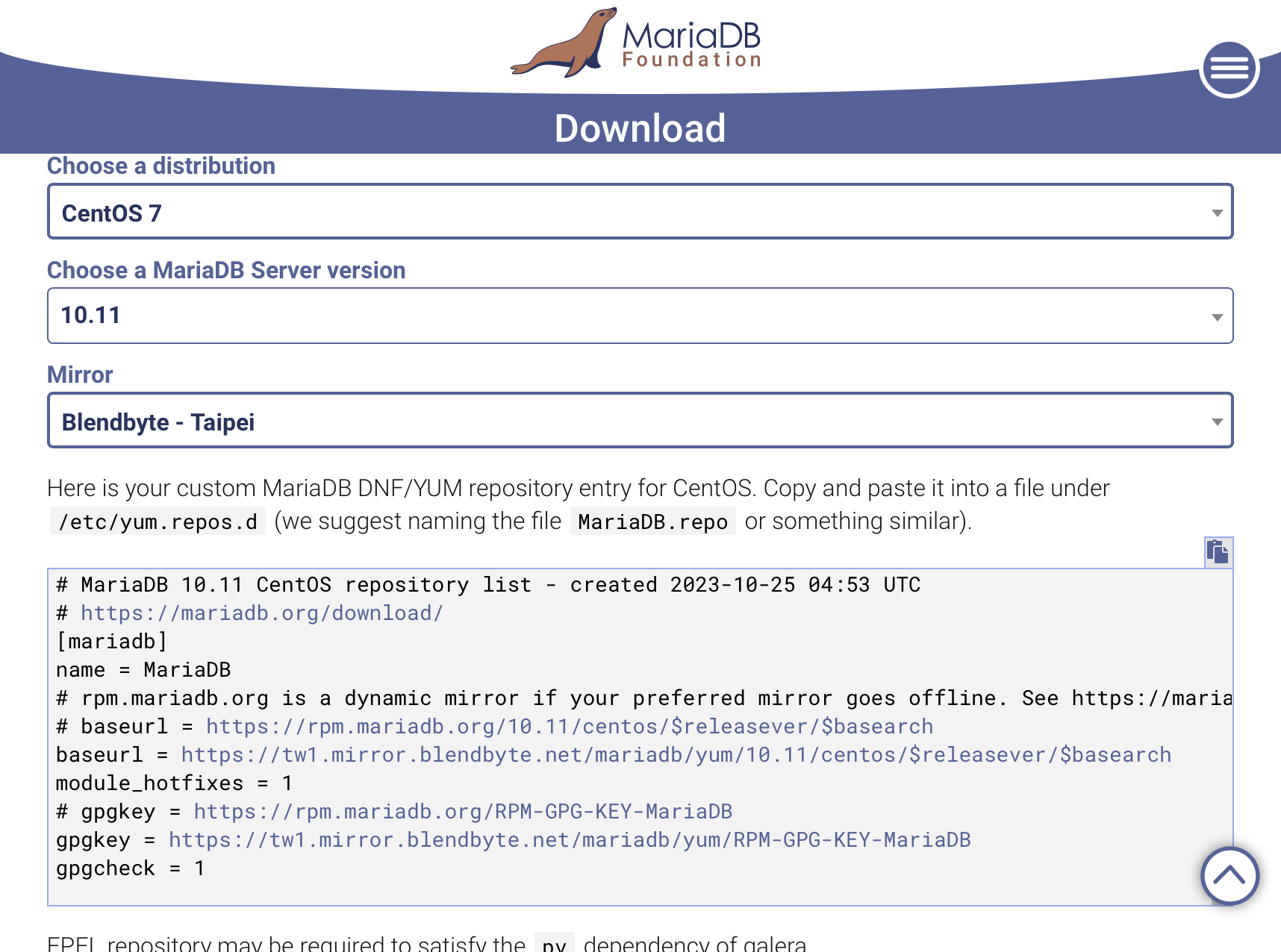 주소 : https://mariadb.org/download/?t=repo-config&d=CentOS+7&v=10.11&r_m=blendbyte